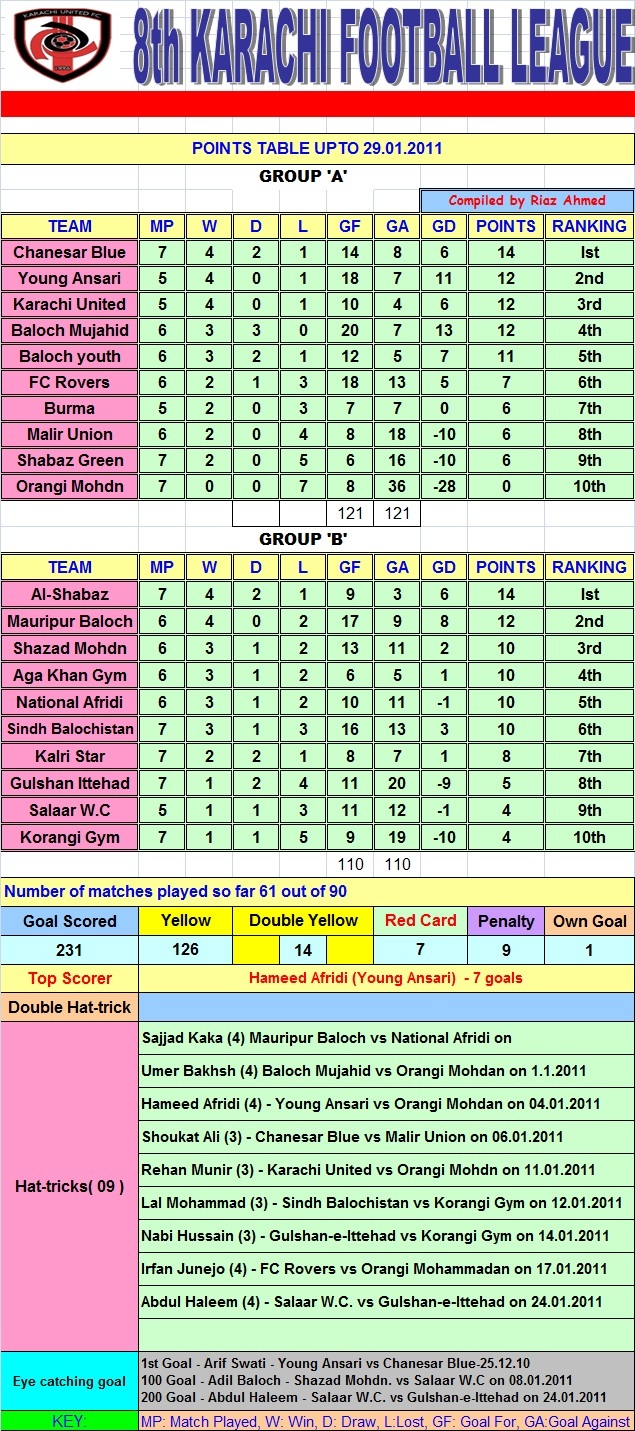 Referees were Babar Khan, Farrukh Riaz, Riaz Baloch and Ch. Sarfraz, while match commissioner was Abdul Karim (Member Central Zone). The result left both teams on 6 matches each with Baloch Mujahid in 4th place with 13 points while Malir Union are 8th with 6 points. On Monday 31 January 2011, defending champs Chanesar Blue face Orangi Mohammadan while FC Rovers (Malir) face Burma Mohammadan.
