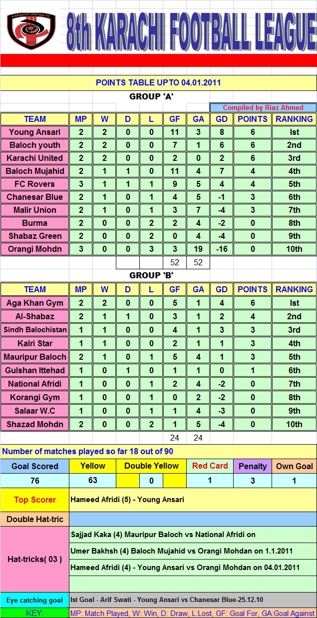Tournament organisers Karachi United overcame Shabaz Green (Zone West) in a tight 1-0 affair while Young Ansari (Zone West) beat neighbours Orangi Mohammadan 6-2 to record their second successive victories in the 8th Karachi Football League 2010-11, Group ‘A’ at Baloch Mujahid Stadium in Ibrahim Hyderi, Karachi. Both winning teams earned 3 precious points each to go on 6 points after two games. Shabaz Green and Orangi Mohammadan could not open their account from 2 and 3 matches respectively.