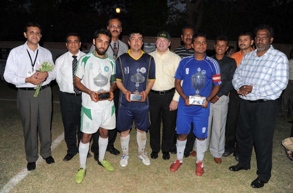 The Chief Guest Mr. Louis R. Ariano, Registrar, Aga Khan University in presence of Riaz Akbar Contractor, Chief Organizer and Manager AKU Sports Centre, Hanif M. Shariff, Sr. Manager Administrative Services, AKU, Amin Lakhani, Manager Students Campus Life, AKU, Qamar Yar, Secretary, Sindh Football Referee Association distributed the prizes among the players. The NED Captain Rafay Fahim received the Winning Trophy while BUITEMS Skipper Shahabuddin received the Runner’s-up Trophy. The 3rd position trophy was received by Zahir Hussain, Captain of AKU Football Team who earlier defeated Hamdard University by 2-1 goals.