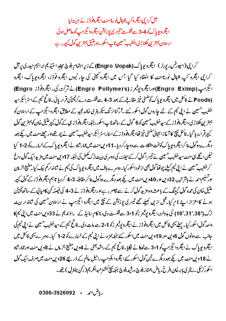 Engro Foods won the final 4-3 against Enrgo Vopak with Syed Khateeb Hussain scoring all four goals for winning team. According to organiser Khalid Maheed, Arslan of Engro Eximp was declared best player, Khateeb Hussain of Engro Foods won top scorer award with 6 goals, while Engro Foods’ Ateeq Khan was best goalkeeper.