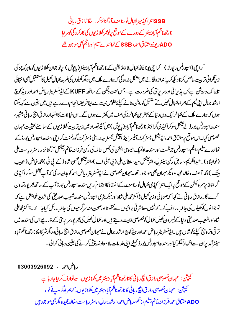 Also present at the occasion were SSB officials Saleem and Anjum, ADO Revenue for CDGK Mushtaq Ahmed, journalist and Sindh Olympic Association general congress member Farzana Khanum, football organiser Master Riasat Ali (Nawabshah), ex-member Central Zone FA Abdul Karim, internationals Syed Sultan Ali (PIA), Mohsin Shah (KPT), M. Faiz (HBL), M. Asif, Khalid Majeed, et al.