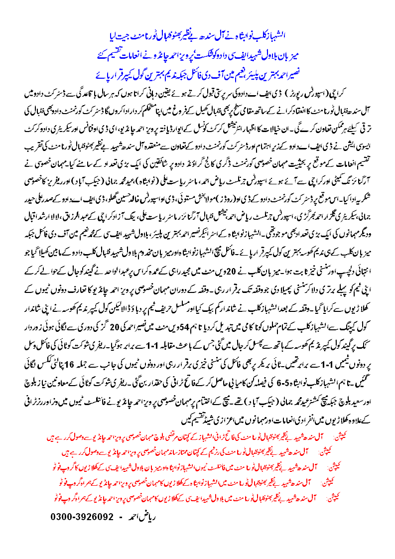 In the final game, Al-Shabaz Club Nawabshah defeated host Makhdoom Bilawal Shaheed Football Club Dadu 6-5 on a penalty shoot out. Match remained 1-1 at full time.