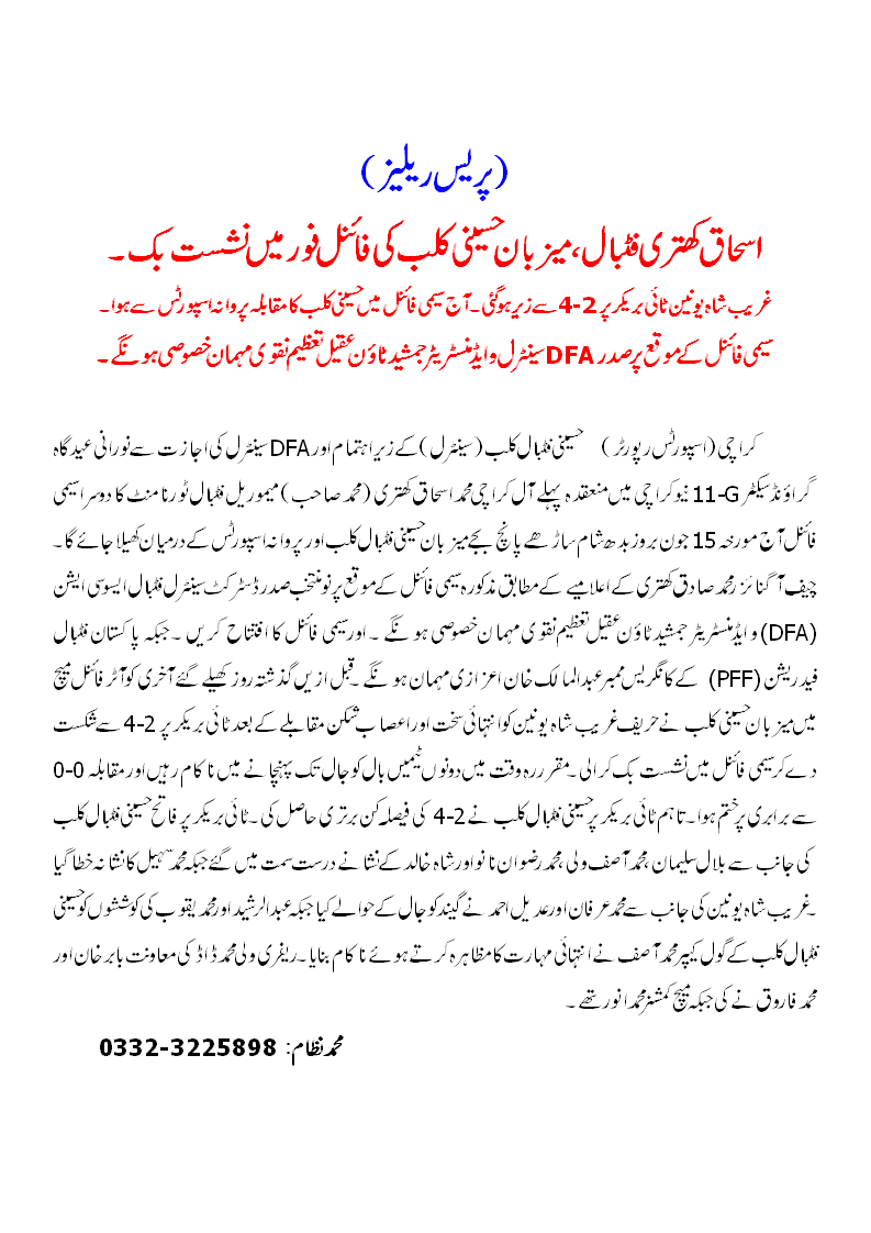 The All-Karachi Ishaq Khatri Memorial Football Tournament saw hosts Hussaini FC (New Karachi) qualify for the semis after beating Gharib Shah Union 4-2 on penalties following a 0-0 draw in final quarter-final game held at Noorani Eidgah Ground, Sector G-11 in New Karachi.