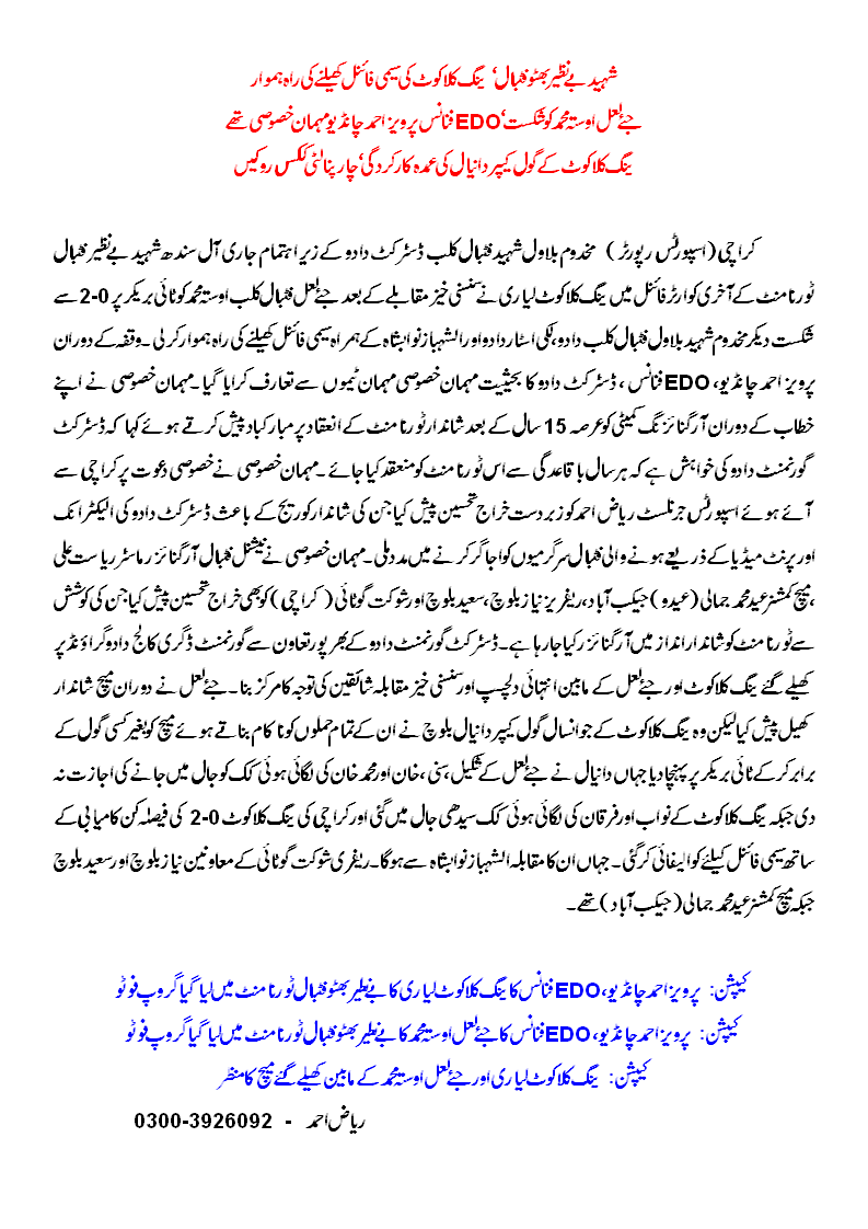 Pervaiz Ahmed Chandio vowed to ensure that this tournament will become an annual fixture in the future with full support from the Dadu district government. He also praised Karachi-based journalist Riaz Ahmed for coming to Dadu and giving tremendous coverage of the event in the nationwide print and electronic media.