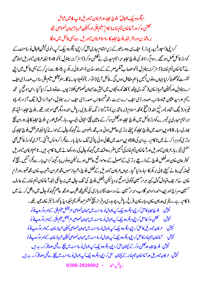 Irfan Memorial and Aga Khan Gymkhana failed to score in normal time, with Irfan Memorial’s Farhan Khan and Fazal Baloch missing two golden opportunities to score as the match had to be decided on penalties. Irfan Memorial prevailed 6-5 in shoot-out thanks to successful kicks by Fazal Baloch, Shahbaz Samoun, M Imran, Shoaib Khan, M Zahoor, and Khurram Khan that AKG goalie Ibrar Hussain failed to save while Afzal Baloch missed his try. AKG’s Arif Hussain, Sirajuddin, Ahmed Dad, Mir Gulab, Ibrar Hussain found the target but M Shakeeb and M Asim failed to score as Irfan Memorial won the game.