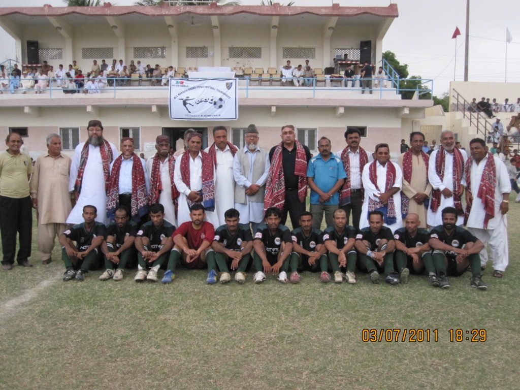 Vice President SFA Fateh Mohammad Baloch, Secretary West Rahim Bakhsh, President South FA Gulab Baloch, Secretary Jan Mohammad, Vice Presidents DFA Central International Saleem Patni, M. Shamim, Adam Jan, Vice Presidents DFA East S. Usman Shah & M. Rahim, sponsor S. Ammar Shah, Organizing Secretary Riaz Ahmed were also present.