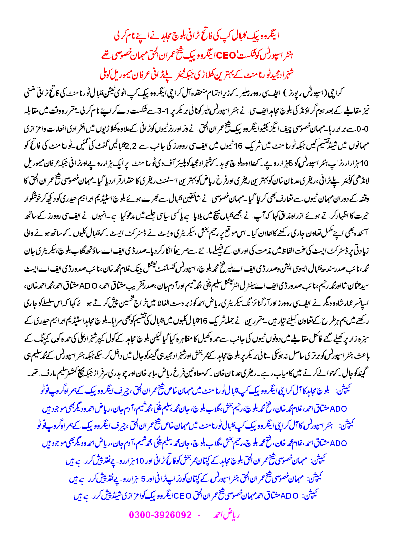 Baloch Mujahid pocketed Rs 10,000 winners prize while Hunter Sports got Rs 5,000 runners up prize and trophy. Baloch Mujahid’s Shahzad Majeed got Rs 1,000 prize as Best Player while Irfan Memorial FC (Landhi) got Fair Play Trophy, Adnan Khan was declared Best Referee while Farrukh Riaz got Best Assistant Referee prize. FC Rovers administration also distributed honorary footballs to each of the participating 16 clubs of the Engro Vopak Cup.