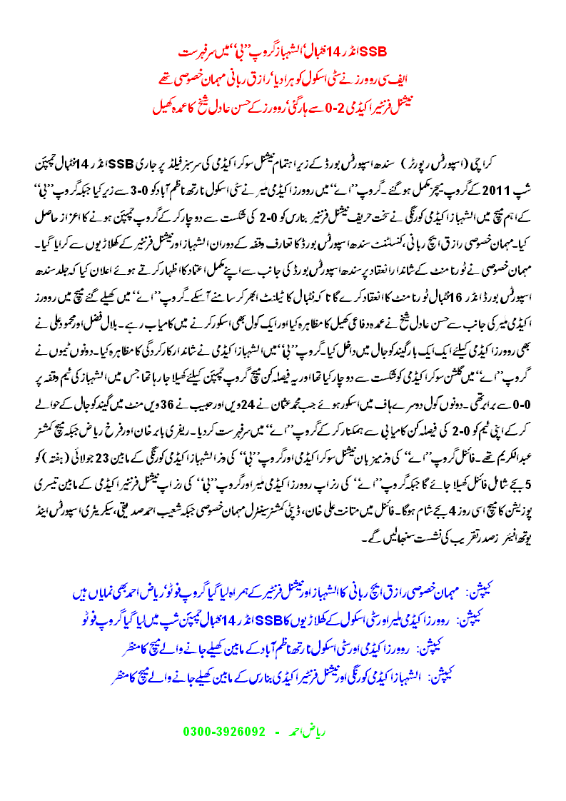 The Sindh Sports Board U14 Football Championship, hosted at National Soccer Academy Ground in Paposh (Karachi), saw its group stage reach a conclusion. In Group ‘A’, FC Rovers Academy (Malir) overwhelmed The City School North Nazimabad 3-0, while in Group ‘B’, Al-Shabaz Academy (Korangi) beat National Frontier Academy (Banaras) 2-0 to top its group.