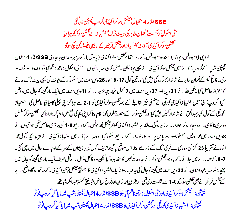 Al-Shabaz Academy Korangi beat Gulshan Soccer Academy 2-1.