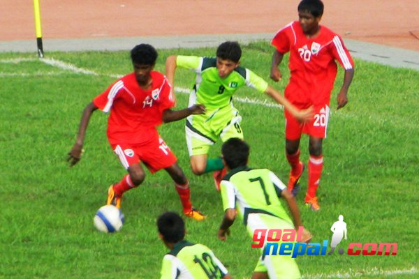 At the Dasarath Rangsala Stadium, Pakistan immediatly put Maldives to the sword from the beginning, when Muhammad Bilal put his side ahead from a Mansoor Khan corner. The early goal, coupled with intense Pakistani pressure, put the Maldivians in complete disarray as they failed time and again to deal with the relentless Pakistani attacks. Muhammad Sohail, Sher Ali, Muhammad Zeeshan all came close to scoring but were unlucky to add to the total as it remained 1-0 in favour of Pakistan at half time.
