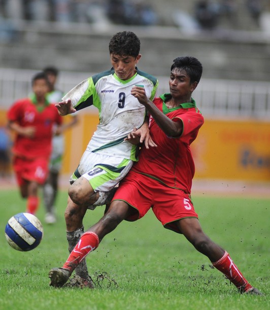 The overnight rain had left a soggy pitch in Kathmandu to play the semi-final on. In the first half, Pakistan came close to scoring at the half hour mark with Mansoor Khan and Muhammad Bilal playing a neat one two at the edge of the Bangladeshi box with the former’s powerful shot going agonizingly close. Bangladesh tried some counter-attacking football but the defence line brilliantly led by Muneer never let them through on goal. Just before the break a Mansoor Khan cross almost found Muhammad Zeeshan whose slide in on goal only missed the ball and glory by a fraction of a second. The game was generally well contested but remained goalless in the first half.