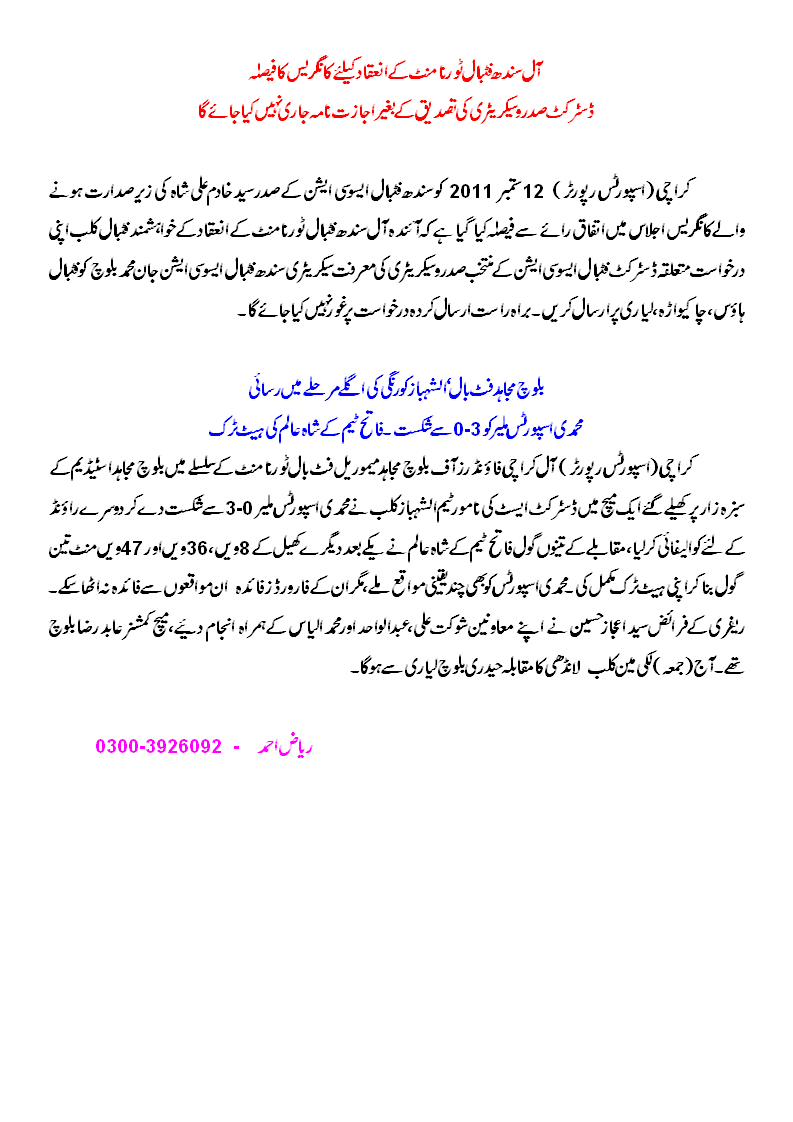 The Sindh FA’s annual congress held on 12 Sept 2011, and presided over by SFA president Syed Khadim Ali Shah, agreed that any football club willing to host the next All-Sindh Football Tournament should submit a formal application with official approval from President and General Secretary of its native District FA.