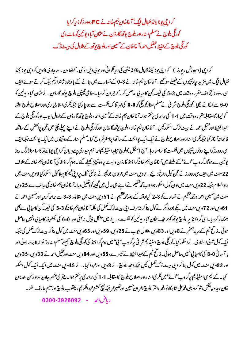 The 9th Karachi United Football League 2011-12 witnessed the results of 4 interesting matches yesterday on Saturday, 30 Oct 2011. In Group ‘A’, Aga Khan Gymkhana (Garden West) came from 0-3 down to beat FC Rovers (Malir) 5-3 in a stunning comeback. Defending champions Baloch Youth FC (Garden) hammered Usmanabad Union 6-0. While in Group ‘B’, Korangi Baloch (Sharafi) humiliated Muslim Star (Korangi) 8-0. At the same day, Kalri Star (Lyari) held Islah Baloch (Old Golimar) 1-1.