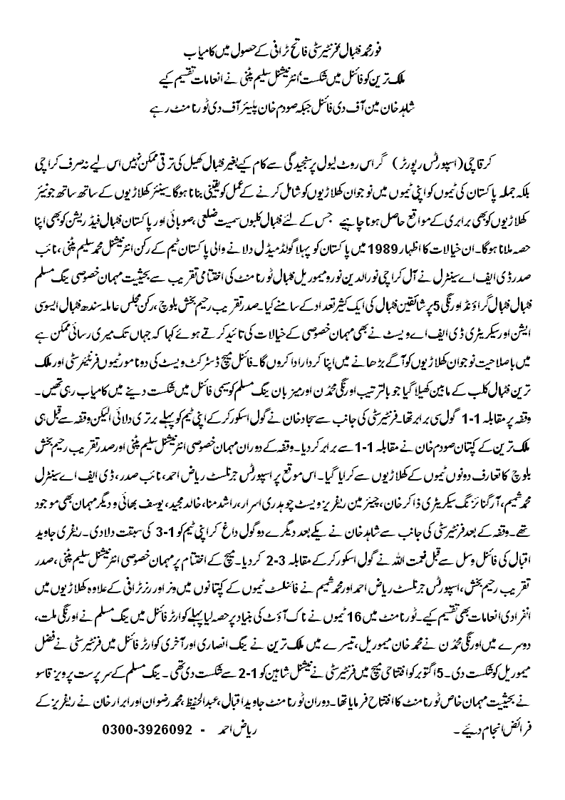 The ceremony was presided over by DFA West secretary and congress member of Sindh FA Rahim Bakhsh, and he agreed with Saleem Patni’s views about encouraging youth players to participate more in competitive football. Prizes were distributed among the finalist teams, with Frontier City’s Shahid Khan winning man of the final while Malik Tareen captain Sudam Khan winning man of the tournament awards.