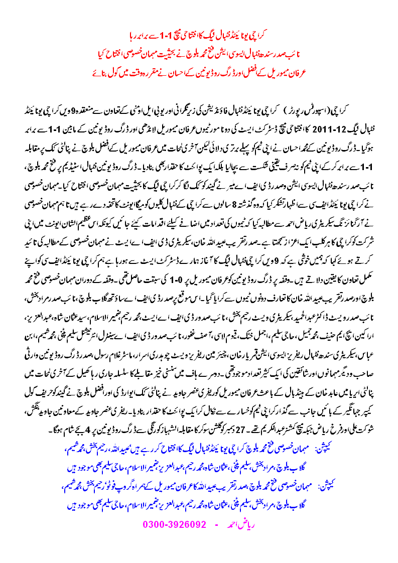 Other officials present at the occasion were DFA South president Gulab Baloch, vice president Murad Bakhsh, DFA West vice president Dr Abdul Hameed, DFA West secretary Rahim Bakhsh, DFA East vice presidents M Rahim, Zameerul Islam, Syed Usman Shah, Abdul Aziz, members H M Hanif, M Jameel, Haji Saleem, Ajmal Khattak, Qayyun Laasi, Asif Ghafoor, DFA Centra vice presidents Saleem Patni, M Shamim, Ibn Abbas, Sindh Football Referees Association secretary Qamar Yar Khan, DFA West Referees chairman Ch. Israr, Master Ghulam Rasool, Drigh Road Union FC president Mr Warsi, journalist KUFL organiser and Irfan Memorial FC president Riaz Ahmed et al.