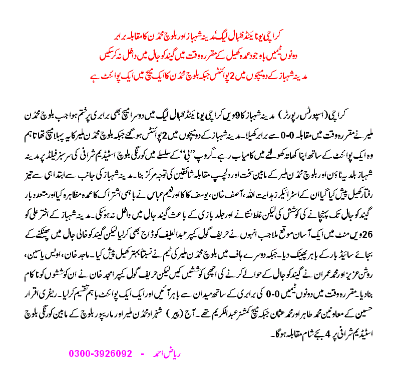 The 9th Karachi United Football League 2011-12 saw Madina Shabaz (Baldia Town) face another draw as they were held 0-0 by Baloch Mohammadan (Malir) in their Group ‘B’ fixture at Korangi Baloch Stadium in Sharafi, Karachi.