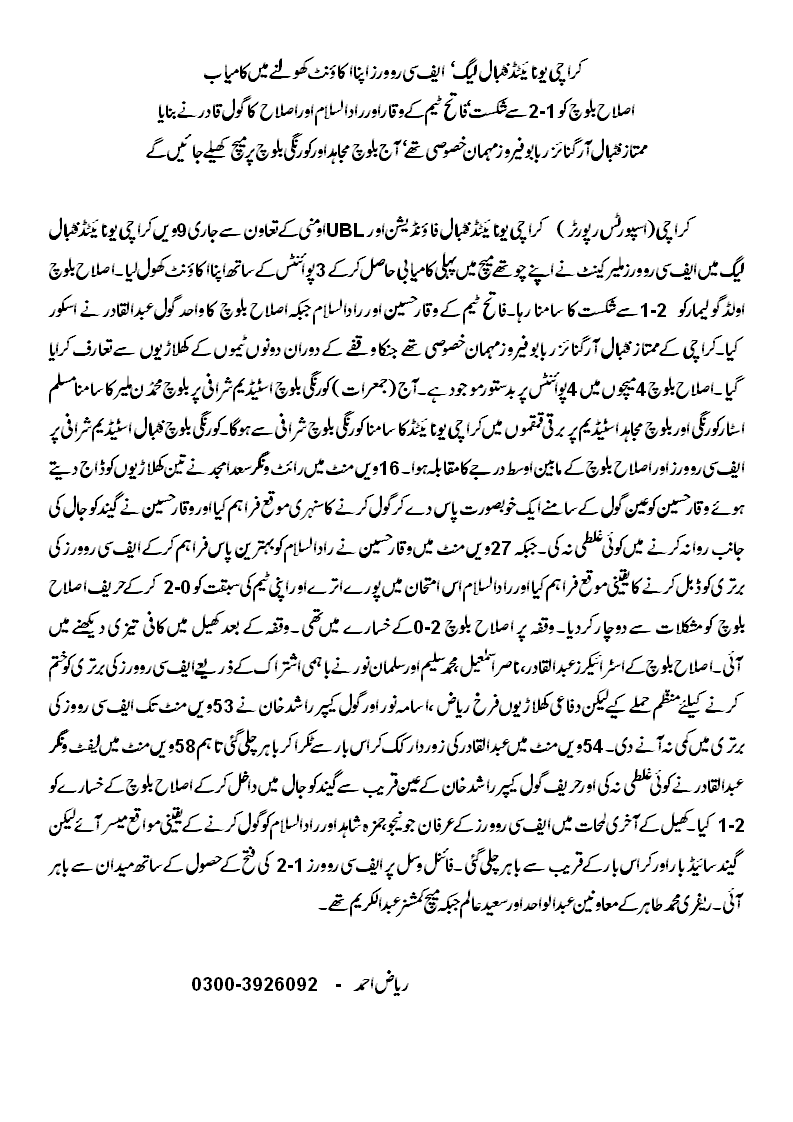 Abdul Qadir struck the crossbar in 53rd minute before eventually scoring 5 minutes later to make it 2-1. Rovers had the chance to kill off the game in final moments of match but Irfan Junejo, Hamza Shahid, and Raad us Salam missed some glorious chances as their side stuck on with a 2-1 win in the end after starting the campaign with 3 successive losses. Islah Baloch are on 4 points from 4 games. Referees were M Tahir, Abdul Wahid, Saeed Alam, and match commissioner Abdul Karim.
