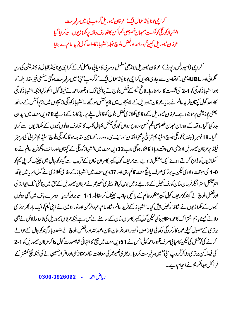 The result gave Irfan Memorial 8 points from 4 games as they topped Group ‘B’ while Al-Shabaz were on 3 points from 3 games. Referees were Naseer Umar, Khalid Mumtaz Jami, and Iqrar Hussain, while match commissioner was Abdul Karim. On Saturday, 19 Nov 2011, Shazad Mohammadan face fellow Malir side FC Rovers at Korangi Baloch Stadium.