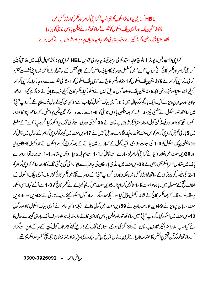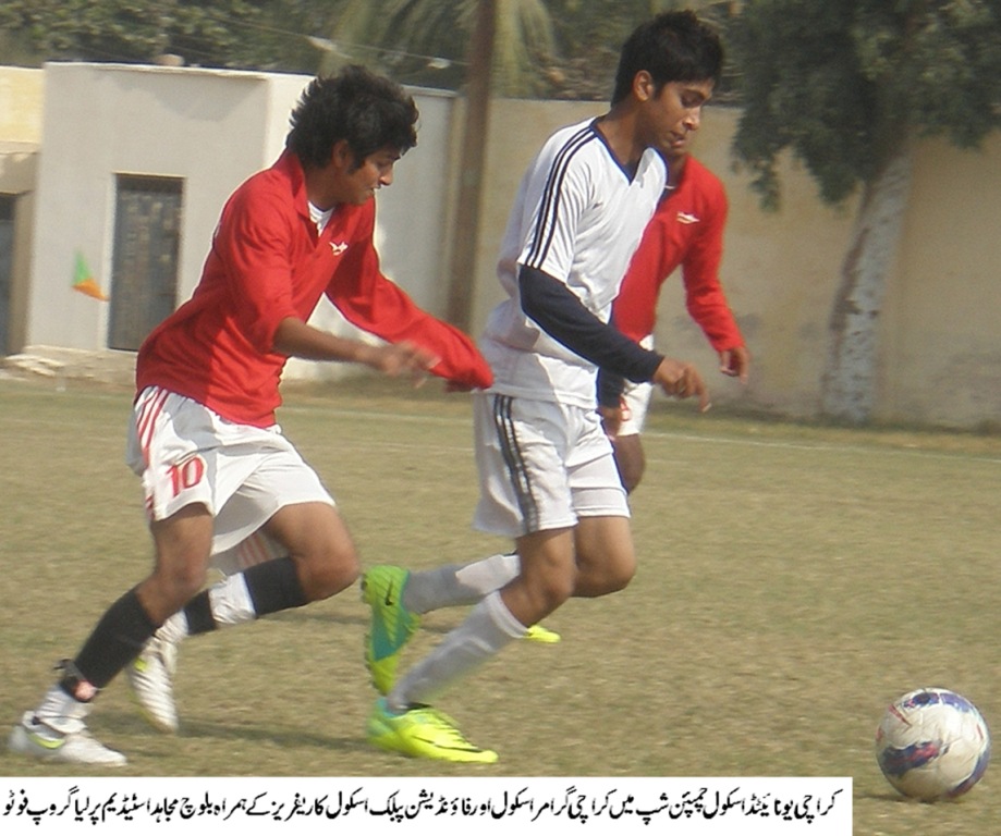 In the Group ‘A’ matches Defending Champion Karachi Grammar School scoring two goals in each half beat Foundation Public School 2-1. Adeel Sohail took the lead to FPS in the 17th minute which is not maintained and Afshad Wania levelled the score in 28th minute. Decisive goal scored by Captain Shazer Razi on penalty kick awarded by Referee Babar Khan in 38th minute for the winners.