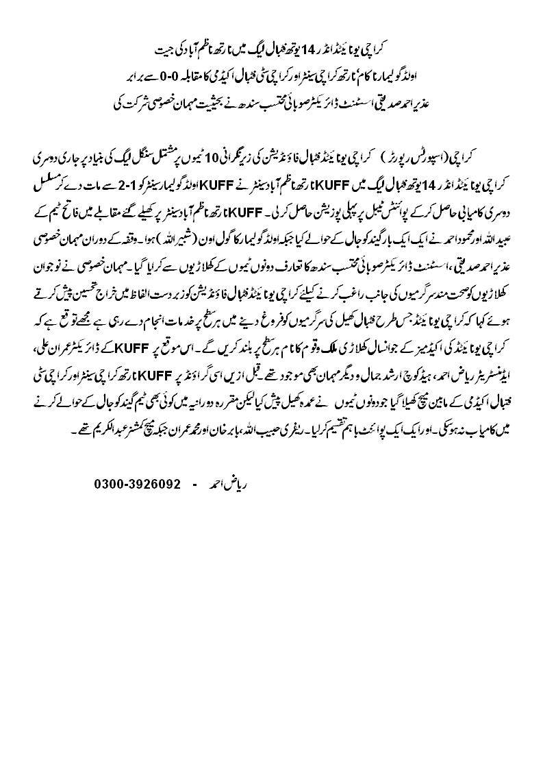 KUFF North Nazimabad Centre beat KUFF Old Golimar Centre 2-1. Ubaid Ullah and Mehmood Ahmed scored once each for N. Nazimabad while Old Golimar got one courtesy of a Shabbir Ullah own goal.
