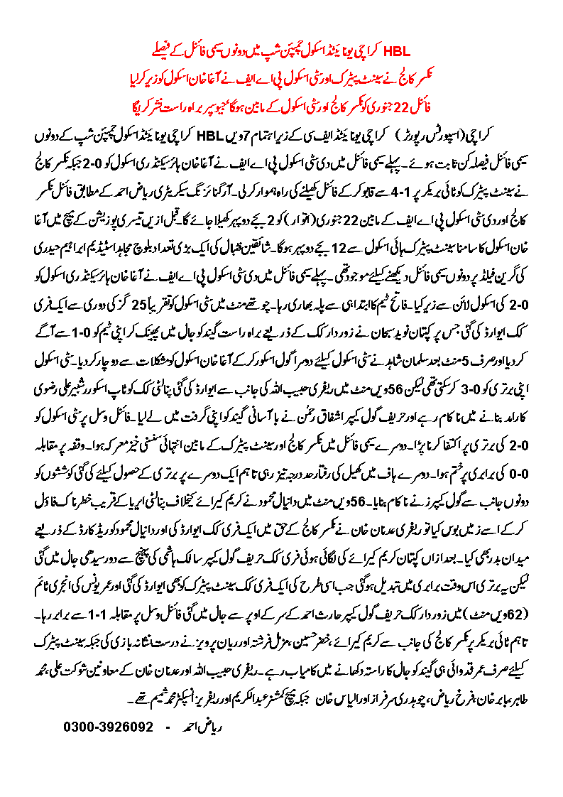 The 7th HBL Karachi United Schools Championship 2011-12 saw the culmination of its 2 semi-finals yesterday, 20 January 2012, at Baloch Mujahid Stadium in Ibrahim Hyderi, Karachi.