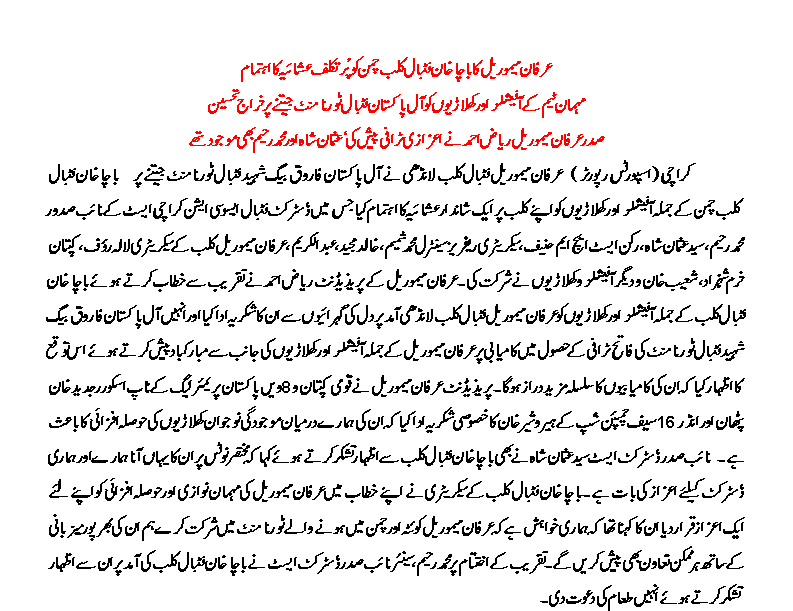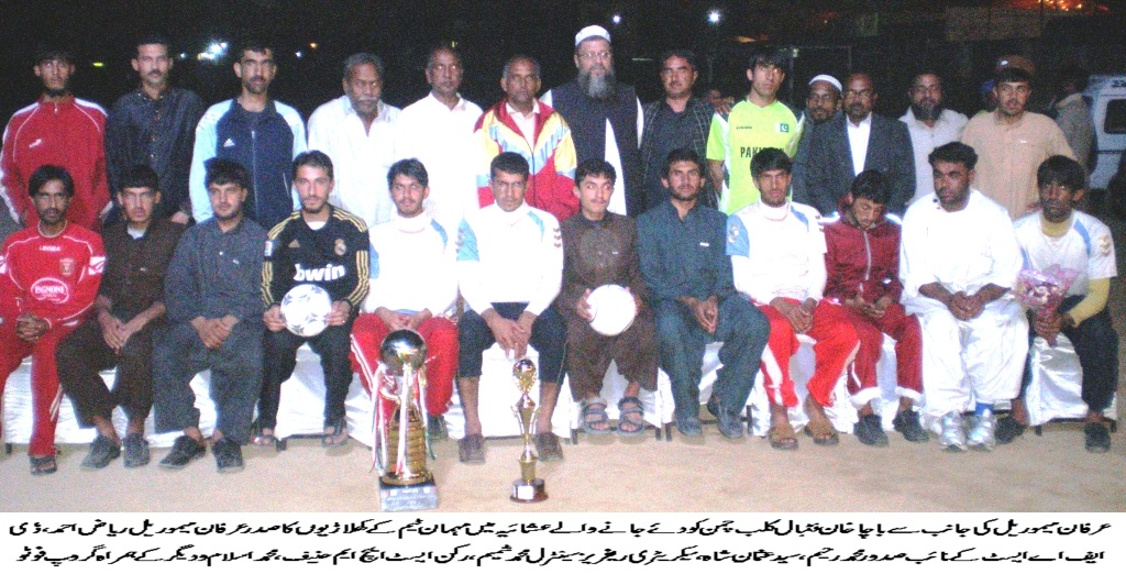 Irfan Memorial FC (Landhi) honoured Bacha Khan FC (Chaman) for winning the All-Pakistan Farooq Baig Shaheed Football Tournament by hosting Bacha Khan’s players and officials in a colourful ceremony yesterday, 15 January 2012. The event was hosted by Irfan Memorial president Riaz Ahmed, DFA Karachi East officials in vice presidents M Rahim, Syed Usman Shah, and member M Hanif, DFRA Central secretary M Shamim, Khalid Majeed, Abdul Karim, Irfan Memorial secretary Lala Rauf, captain Khurram Shehzad, Shoaib Khan etc.