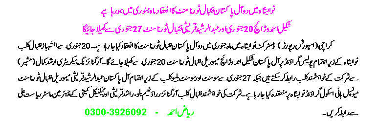 From 20 January onwards, Al-Shabaz FC (Nawabshah) will host the All-Pakistan Shakeel Ahmed Warraich Memorial Football Tournament at Police Ground in Nawabshah city. Interested clubs are welcome to contact tournament organising secretary Arshad Kamal (advisor) for participation in the tournament.