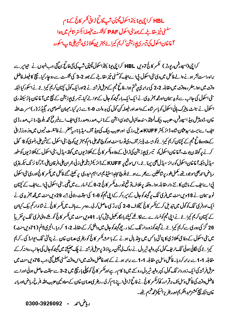 Before the final, Aga Khan Higher Secondary School (AKHSS) won 3rd place after beating St. Patrick’s High School 1-0 thanks to Yasir Shah’s lone goal at same venue in earlier kick-off.