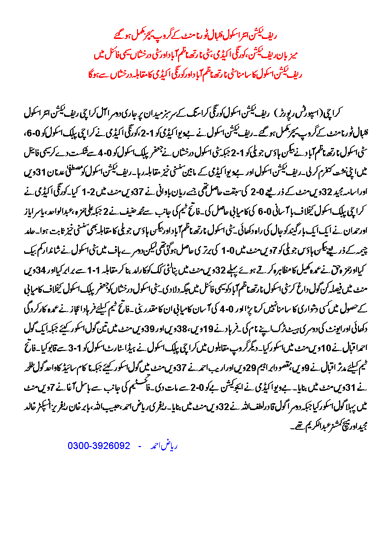 Host team Reflections School beat Bay View Academy 2-1, Korangi Academy smashed Karachi Public School 6-0, City School North Nazimabad beat Beaconhouse Jubilee 2-1, City School Darakhshan beat Jaffar Public School 4-0 to become their respective group’s winners and qualify for the semi-finals. Reflections now face TCS North Nazimabad, while Korangi Academy face TCS Darakhshan in semi-finals.