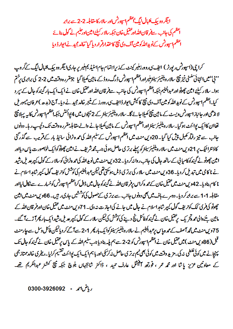 The result left Salaar Welfare Centre on 4 points from 2 games, while Azam Sports were on 1 point from 1 game. Referees were Khalid Mumtaz ‘Jimmy’, On Wednesday (8 Feb 2012), Irfan Memorial (Landhi) face Janbaz Sports (DFA West).
