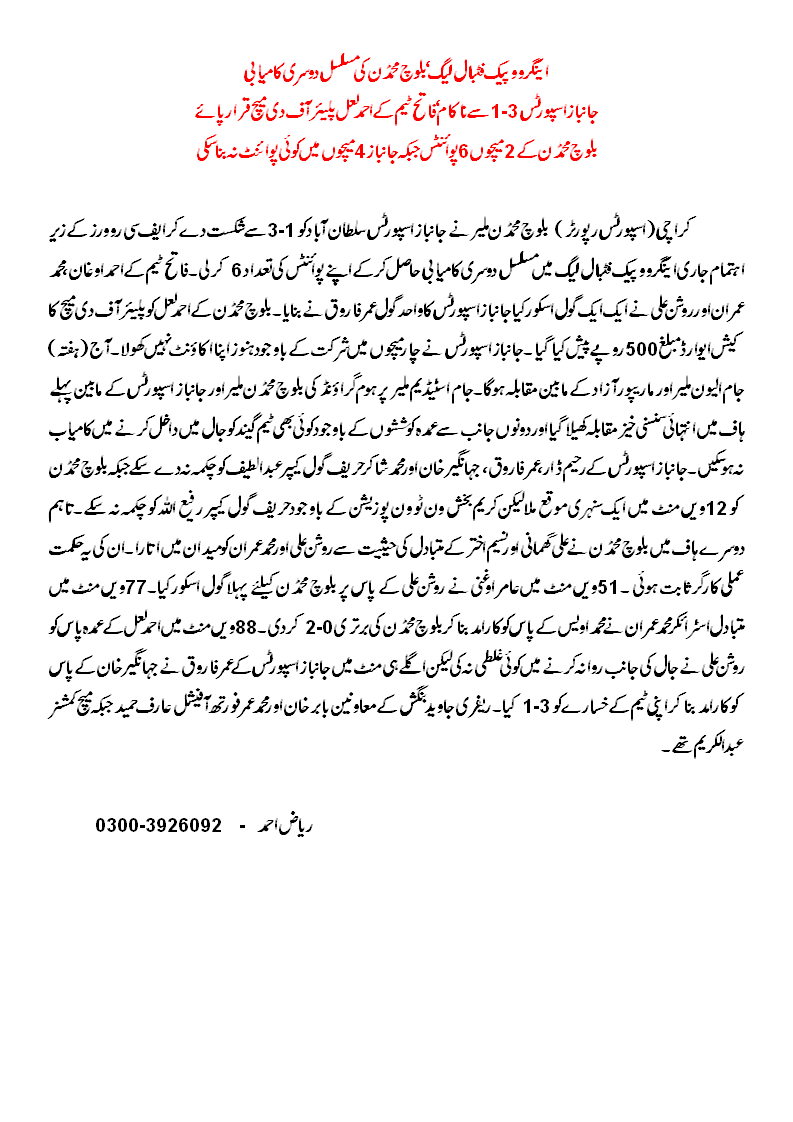 The win left Baloch Mohammadan with 6 points from 2 games, while Janbaz Sports remain on 0 from 4 games played. Referees were Javed Bangash, Babar Khan, M Umar, 4th official Arif Hameed, and match commissioner Abdul Karim. On Saturday 18 Feb 2012, Jam XI (Malir) face Mauripur Azad.