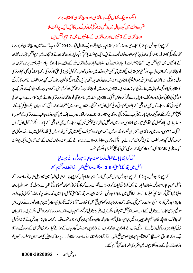The 2012 All-Karachi Engro Vopak Football League, organised by FC Rovers (Malir Cantt) at Jam Stadium Malir (Karachi), saw the Group A clash between Baloch Mohammadan (Malir) and Burma Mohammadan (Korangi) finish goal-less as both sides shared a point each. Both teams are now on 7 points each with Baloch Mohammadan having played 3 games, while Burma Mohammadan have 4 games under their belts.