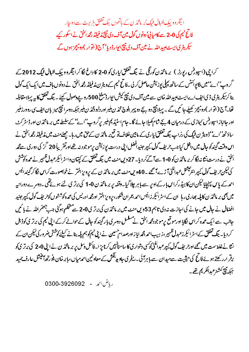 On Sunday, 12 Feb 2012, 2 games will take place. Baloch Mohammadan kick off at 2 PM against fellow Malir side Dilbod Mohammadan, while at 4 PM hosts FC Rovers (Malir Cantt) face Janbaz Sports (Kemari).