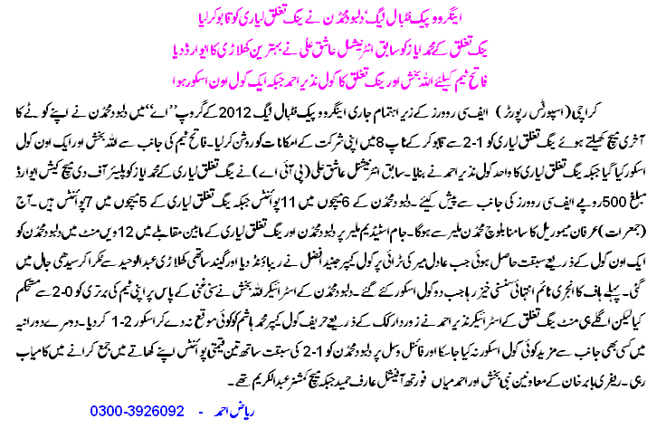 The result saw Dilbod Mohammadan complete its 6 match group stage quota to reach 11 points while Young Tughlaq remained on 7 points from 5 games. On Thursday, 1 March 2012, Irfan Memorial face Baloch Mohammadan.