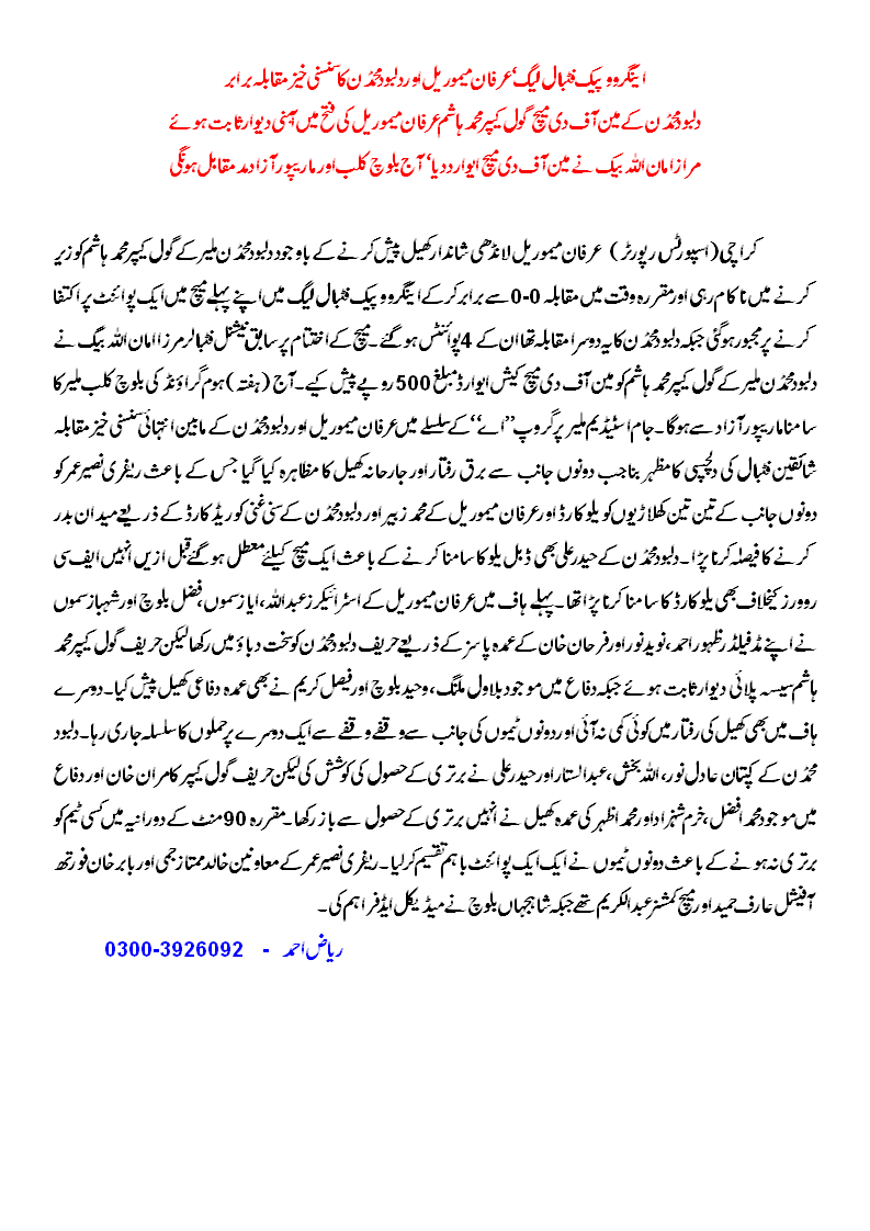 In 2nd half, Dilbod Mohammadan themselves went on the offensive as captain Adil Noor, Allah Bakhsh, Abdul Sattar, and Haider Ali came close but Irfan Memorial’s goalkeeper Kamran Khan, and defenders M Afzal, Ali Khurram Shehzad, M Azhar stopped them from scoring.