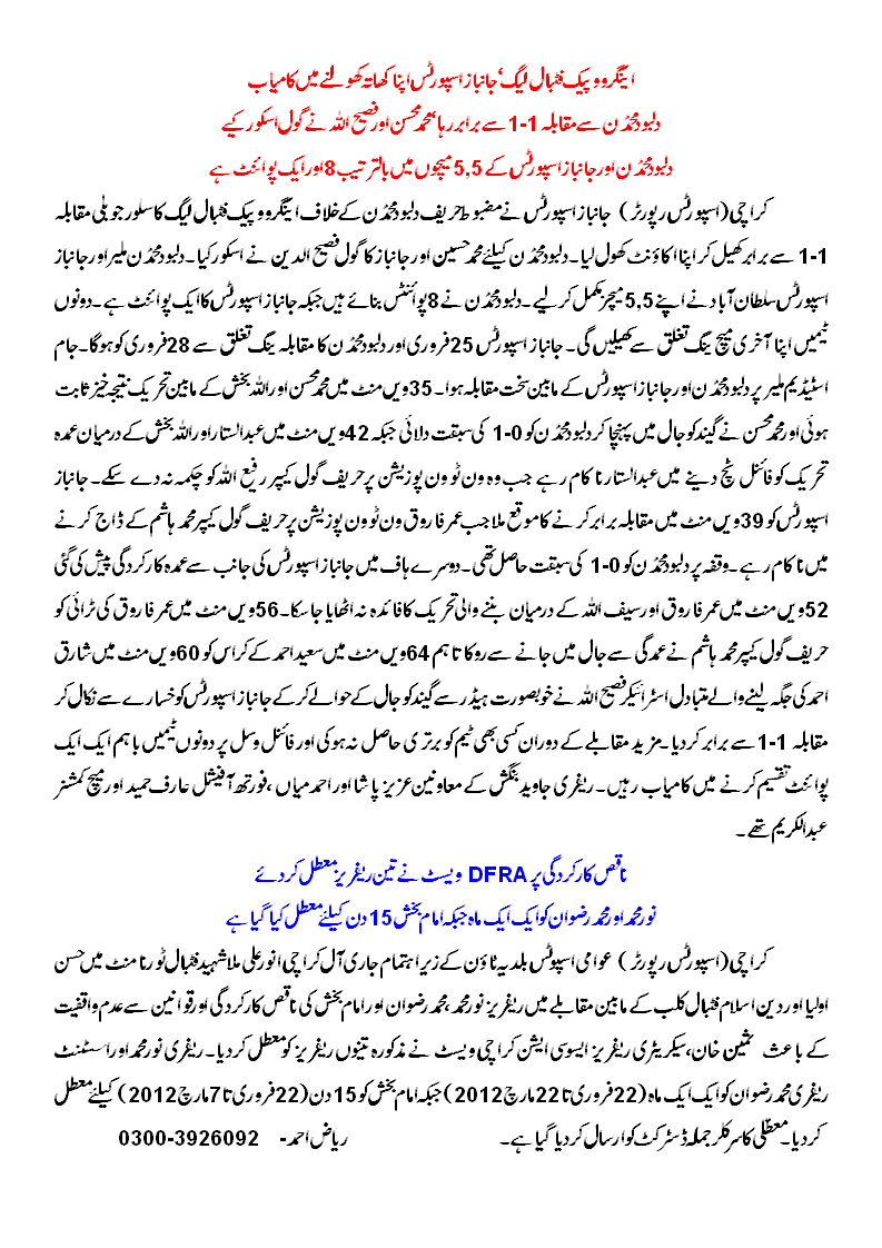 DFRA West secretary Sameen Khan announced that referee Noor Muhammad and assistant M Rizwan were suspended for a month each (22 Feb to 22 March 2012) and Imam Bakhsh for 15 days (22 Feb to 7 March 2012). The suspension notice has been circulated to the said district.