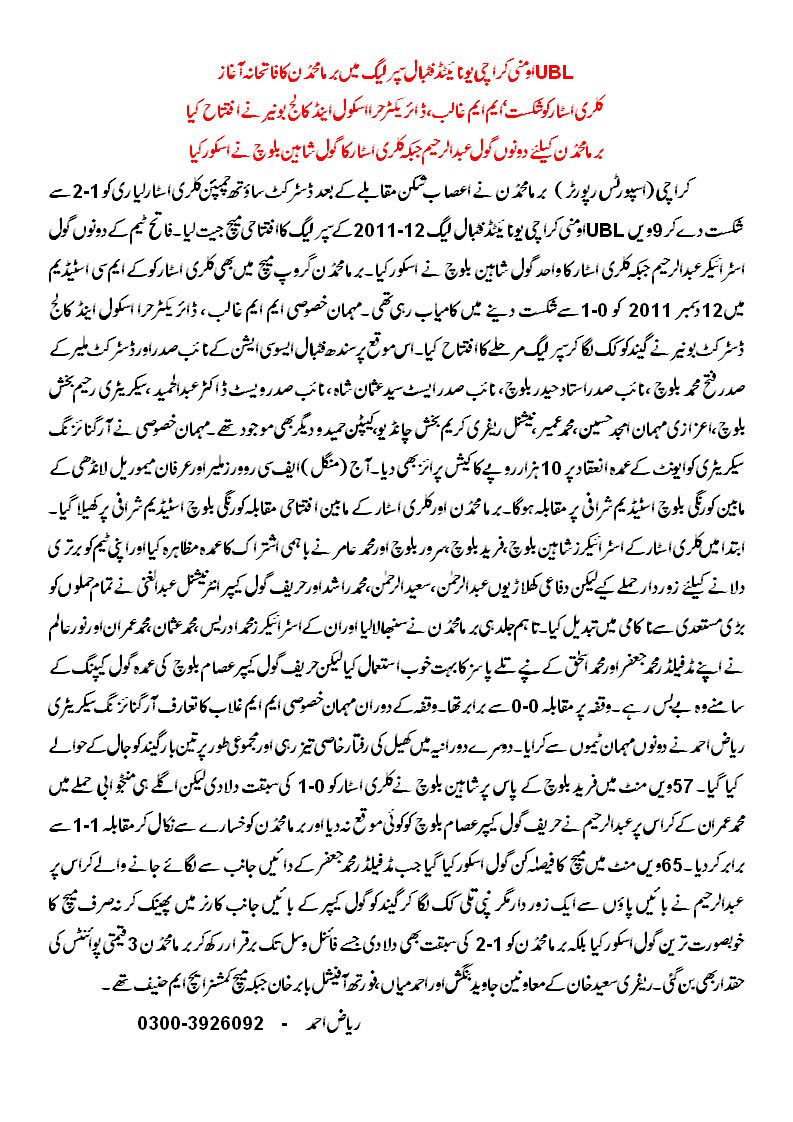 Burma Mohammadan (Korangi) opened the 9th UBL Omni Karachi United Football League 2011-12 Super League round with a closely-fought 2-1 win over Karachi District South champions Kalri Star (Lyari) today 26 Feb 2012.