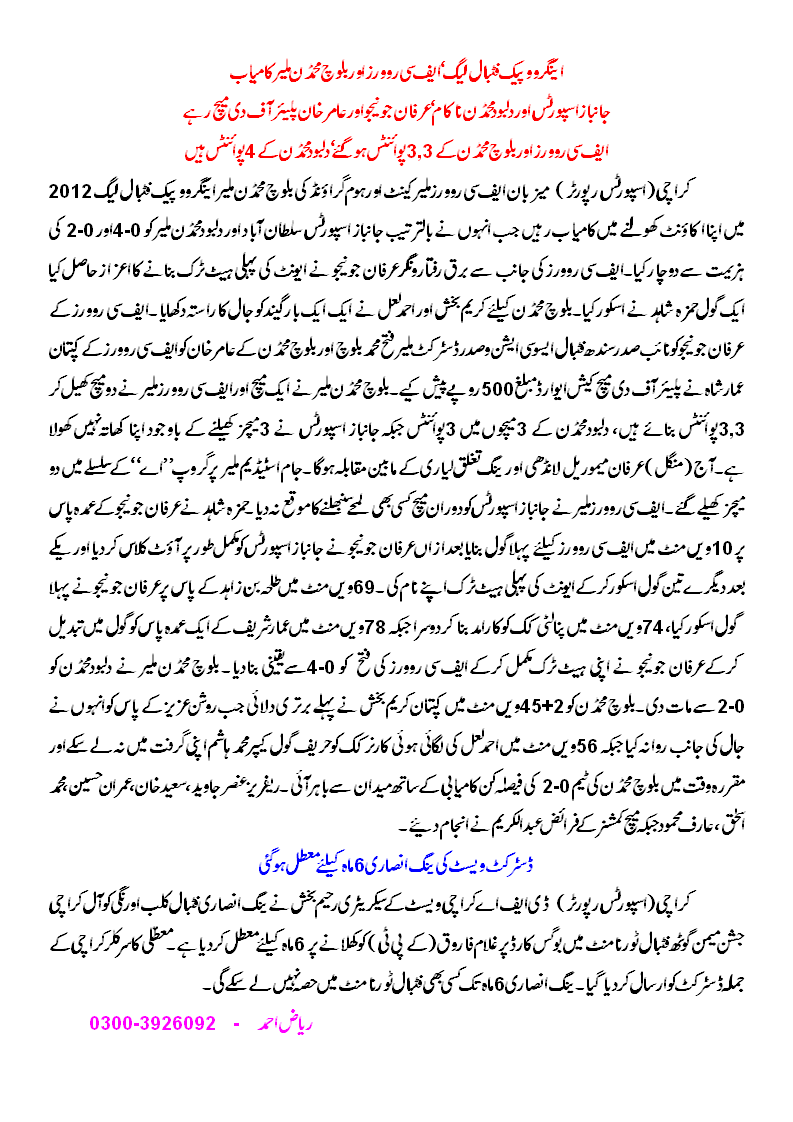 The 2012 All-Karachi Engro Vopak Football League at Jam Stadium in Malir (Karachi) saw the result of 2 Group A games yesterday, 12 Feb 2012. League hosts FC Rovers (Malir Cantt) beat Janbaz Sports (Sultanabad) 4-0, while venue hosts Baloch Mohammadan (Malir) beat fellow Malir side Dilbod Mohammadan 2-0.