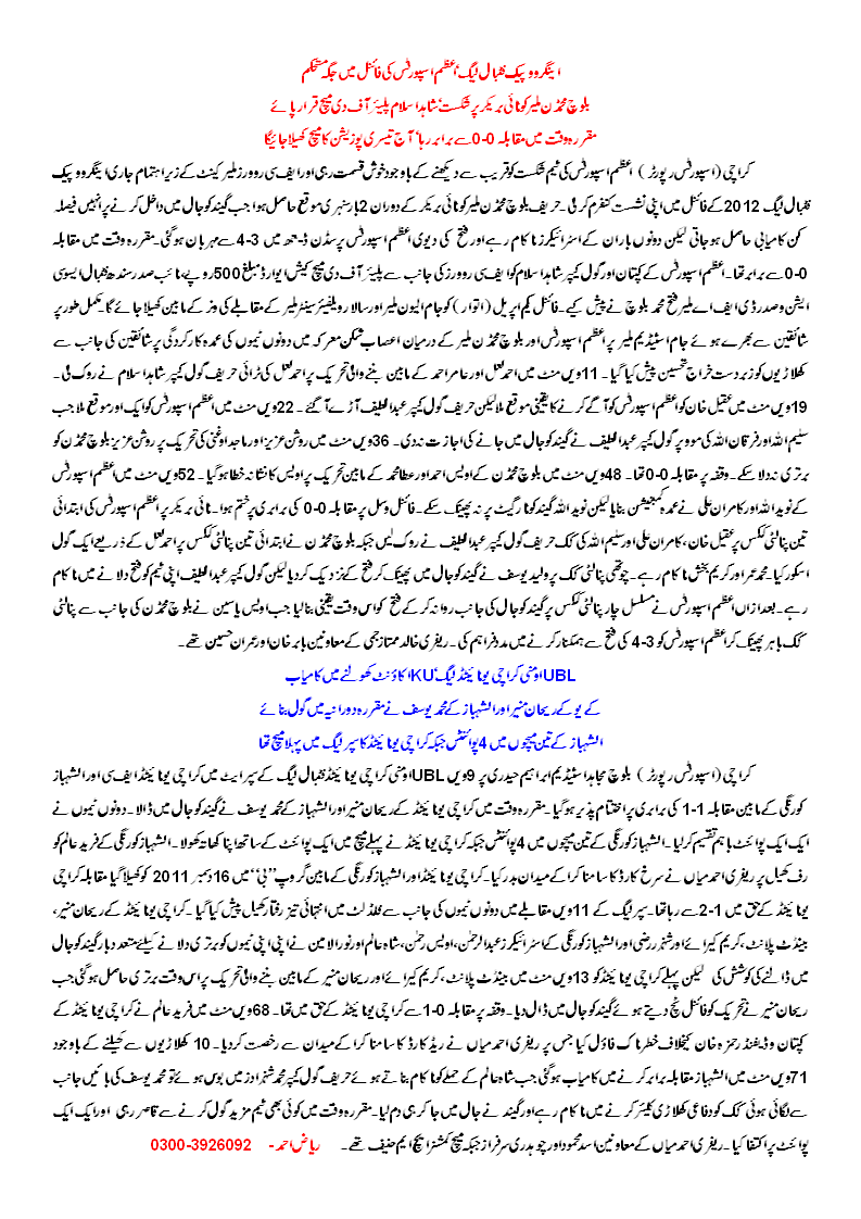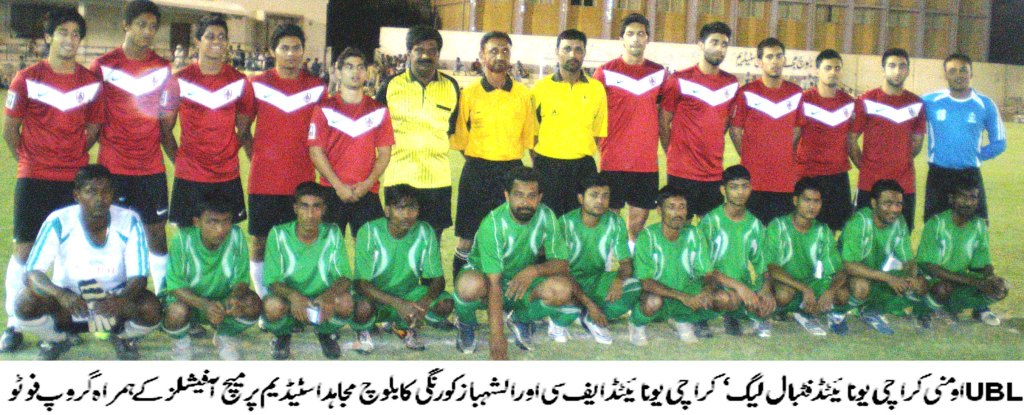The 9th UBL Omni Karachi United Football League 2011-12 Super League phase saw Karachi United FC being held 1-1 by Al-Shabaz Korangi at Baloch Mujahid Stadium in Ibrahim Hyderi (Karachi) yesterday under floodlights.