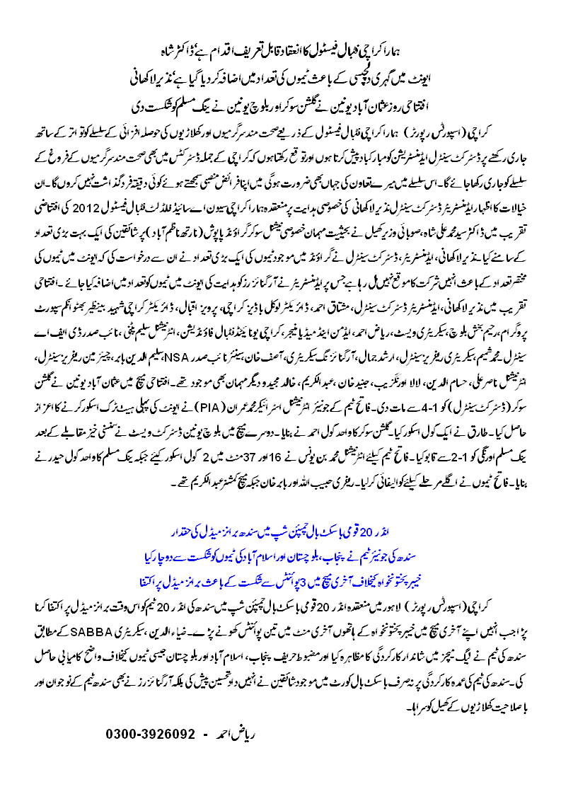Usmanabad Union’s junior international Muhammad Imran (PIA) scored a hat-trick against Gulshan Soccer while Tariq also scored for winning side. Gulshan Soccer could only respond through a goal from Ahmed. For Baloch Union. international star Muhammad bin Younas (KPT) scored twice, while Haider managed one for Young Muslim.
