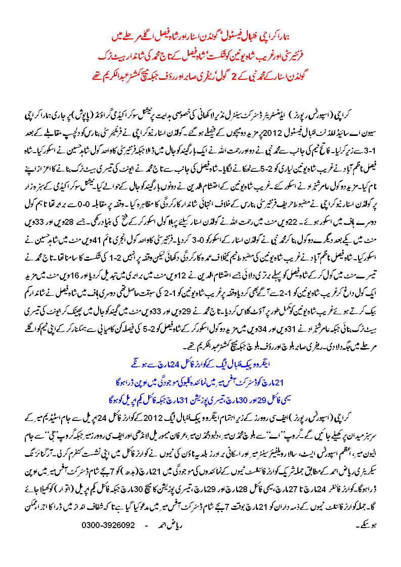 The Hamara Karachi 7-a-side Football Festival 2012 saw the results of 2 games yesterday, 19 March 2012, at National Soccer Academy Ground in Paposh (Karachi).