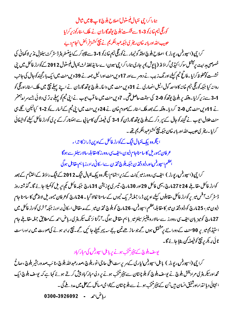 Islah Baloch (Old Golimar) beat Korangi Gymkhana 3-1 while Baloch Youth (Garden) also beat Malik Star (Orangi) 3-1 at the same venue to qualify for next round.