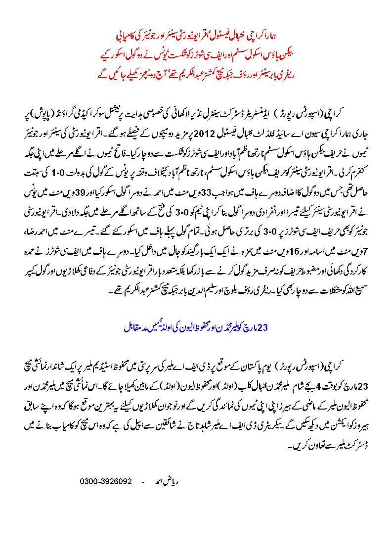 Iqra University seniors had goals from Younas (2) and Ahmed to thank for against BSS North Nazimabad. Iqra University juniors had goals from Ahmed Raza, Usama, and Hamza against FC Shooters.