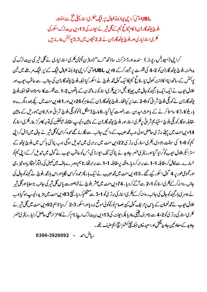 Kalri Star and Baloch Youth Garden both have 3 points each from 2 games