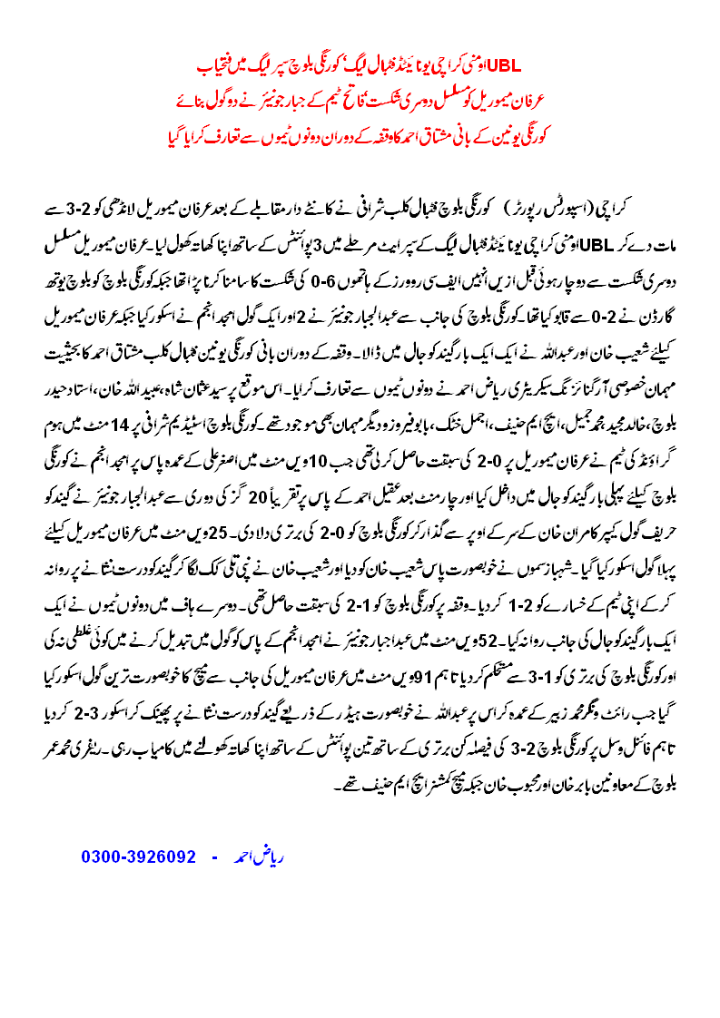 In 2nd half, Abdul Jabbar Jr. again scored from Amjad Anjum’s pass in 52nd minute to make it 3-1 for Korangi Baloch. Irfan Memorial managed a late 91st minute goal from Abdullah when he headed home a cross from winger M Zubair to make it 3-2 but it was too late for an Irfan Memorial comeback. Referees were M Umar Baloch, Babar Khan, Mehboob Khan, and match commissioner H.M.Hanif.