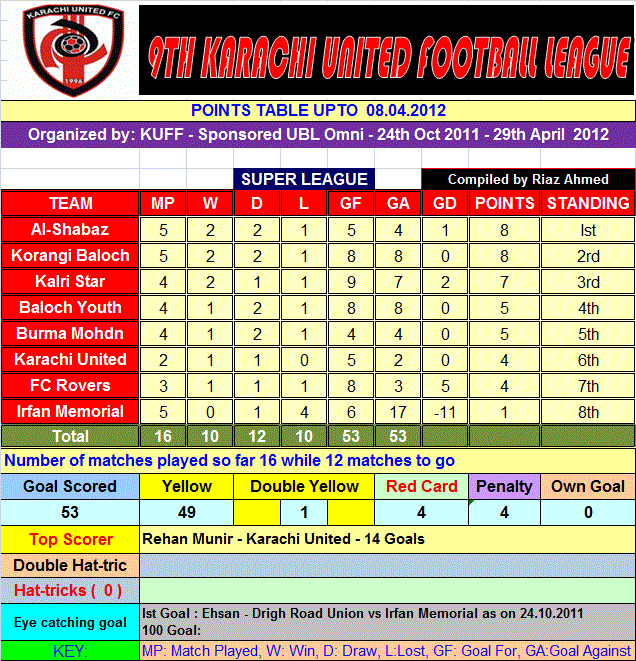 The 9th Karachi Football League 2011-12 saw an intriguing match of Super League phase between Al-Shabaz Korangi and Irfan memorial Landhi on Sunday evening, 8 April 2012.