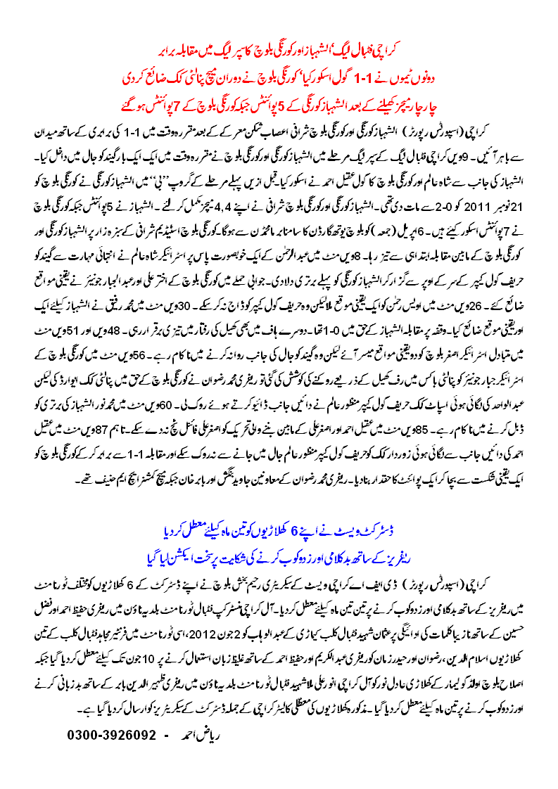 Abdul Wahab (Usman Shaheed FC, Kemari) was banned till 2 June 2012 following his foul language towards referees Hafeez Ahmed and Fazal Hussain in the All-Karachi Minister Cup (Baldia Town). Frontier Mujahid FC (Baldia Town) also saw 3 of its own players – Islam Uddin, Rizwan, Haidar Zaman – banned till 2 June 2012 for misbehaving with referees Abdul Karim and Hafeez Ahmed in same tournament.