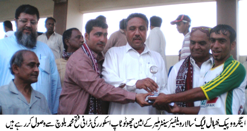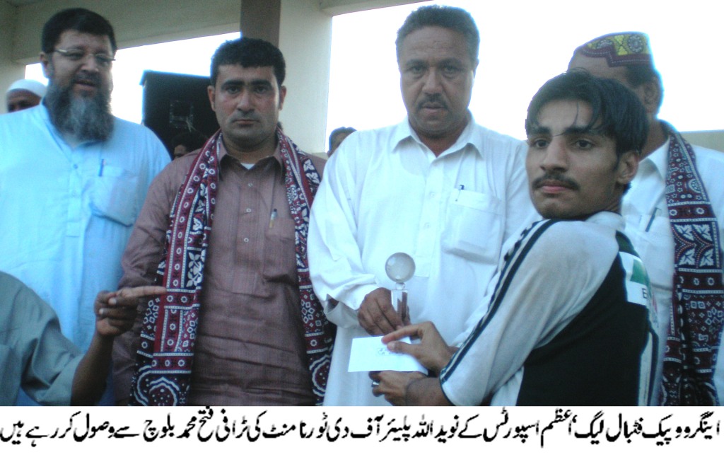 Azam Sports captain Shahid Islam received winners trophy and Rs 50,000 1st place award, Jam XI captain received 2nd place trophy and Rs 30,000 2nd place prize, Baloch Mohammadan captain Ahmed Lal received 2rd place trophy and Rs 20,000. Azam Sports’ Naveed Ullah was declared Best Player, Jam XI’s Arshad Nabi was best goalkeeper, and top scorer Amin Chottu (Salar Welfare Centre) received Rs 5000 individual prizes each. Also rewarded were organising committee chairman Fateh Muhammad Baloch (DFA Malir) and secretary Riaz Ahmed with cell phones.