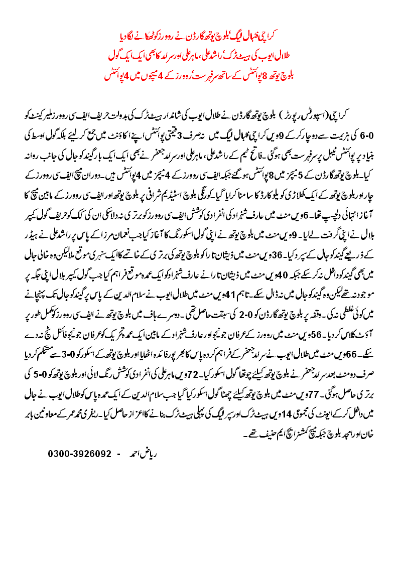 After absorbing early Rovers pressure, Baloch Youth started scoring goals galore after 9 minutes when Rashid Ali headed in a Noman Mirza ball to make it 1-0. Rovers tried to respond through Zeeshan Tara and Arif Shehzad but failed to beat Baloch Youth goalkeeper Bilal. Talal Ayub then made it 2-0 for Baloch Youth when scored from a Salam Uddin pass 4 minutes before half time.