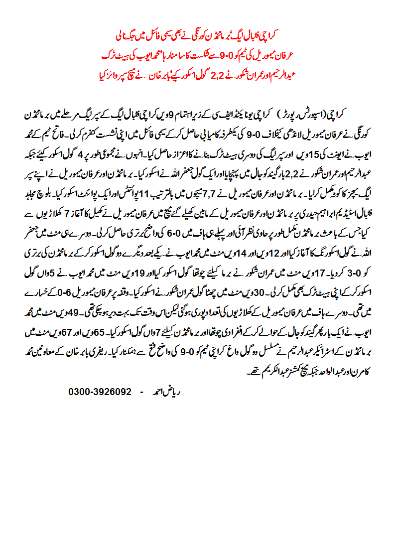 Referees were Babr Khan , Abdul Wahid and Mumtaz Baloch and Match Commissioner Abdul Karim. Both Burma Mohammedan and Irfan Memorial completed their quota of 7 matches. Burma Mohammedan have 11 points while Irfan Memorial have only one point.